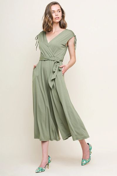 Sage green sleeveless jumpsuit has crossbody design with v-neckline. This wide legged jumpsuit has cinched shoulder tie accents, self waist tie and pockets. Crossbody wrap has deep v-back design. Fabric is a rayon blend. Size: S-M-L.